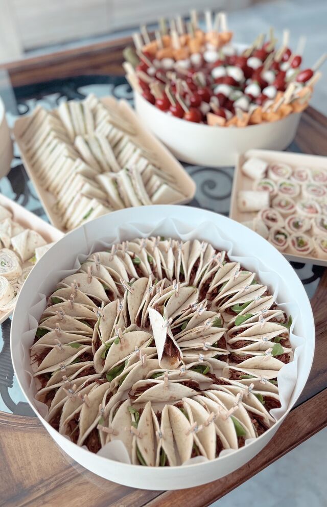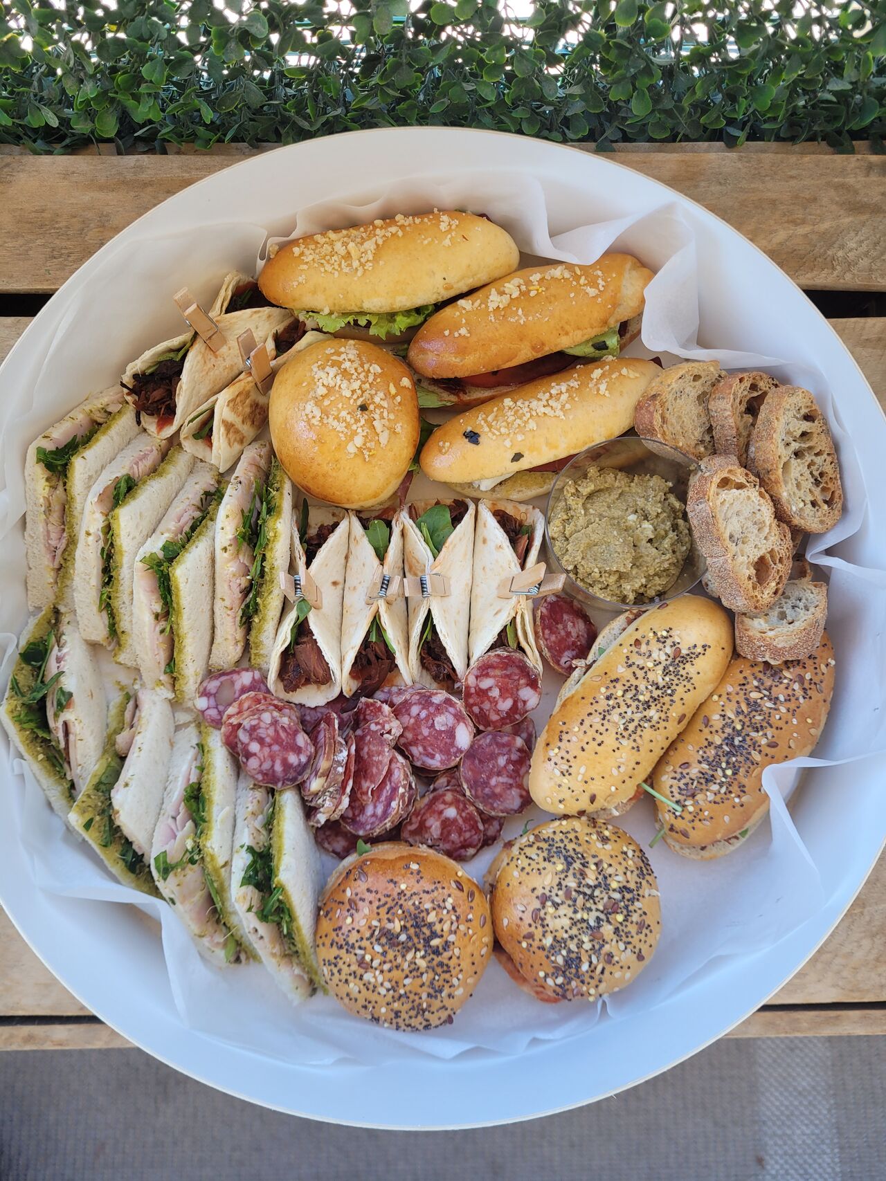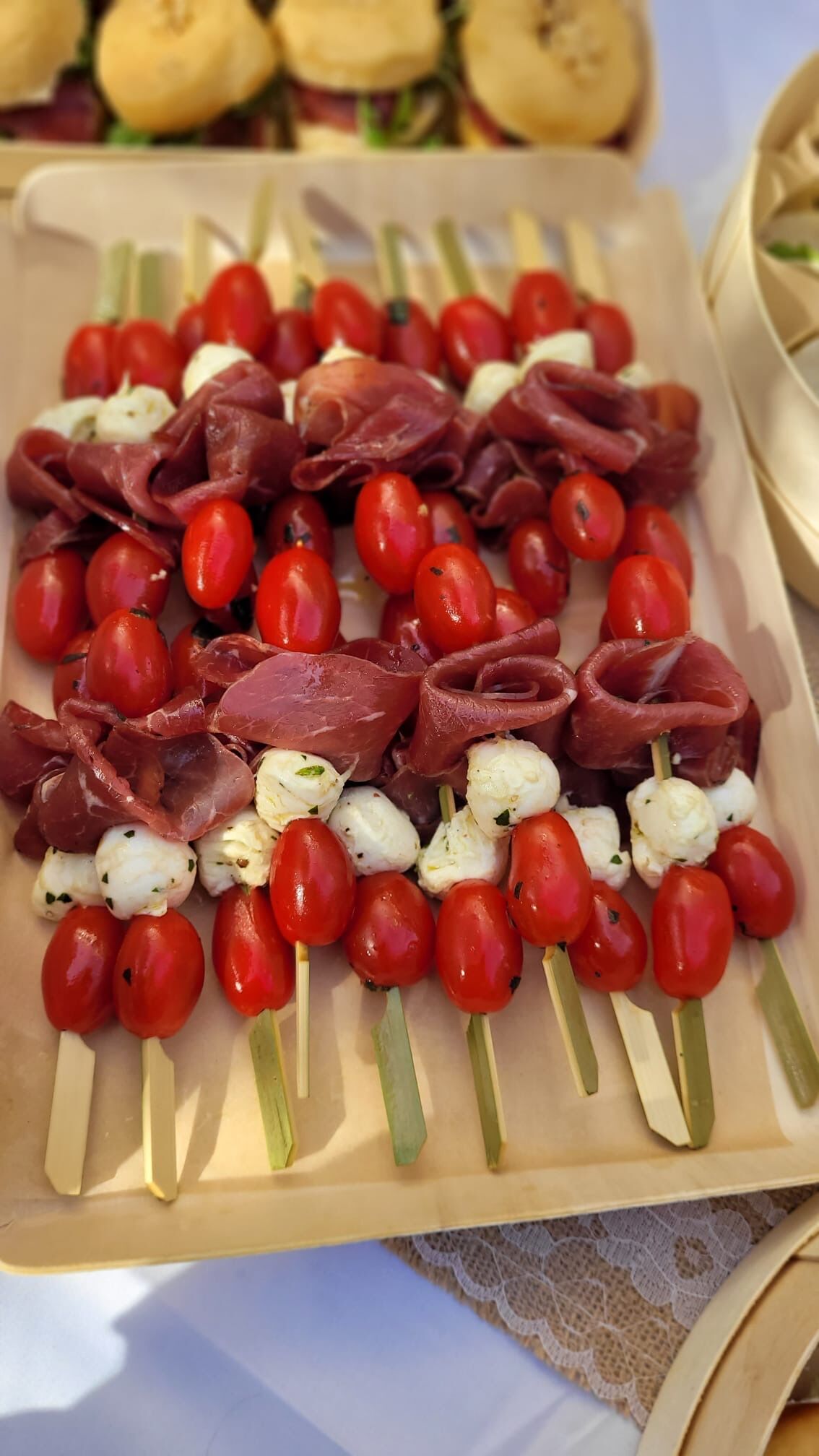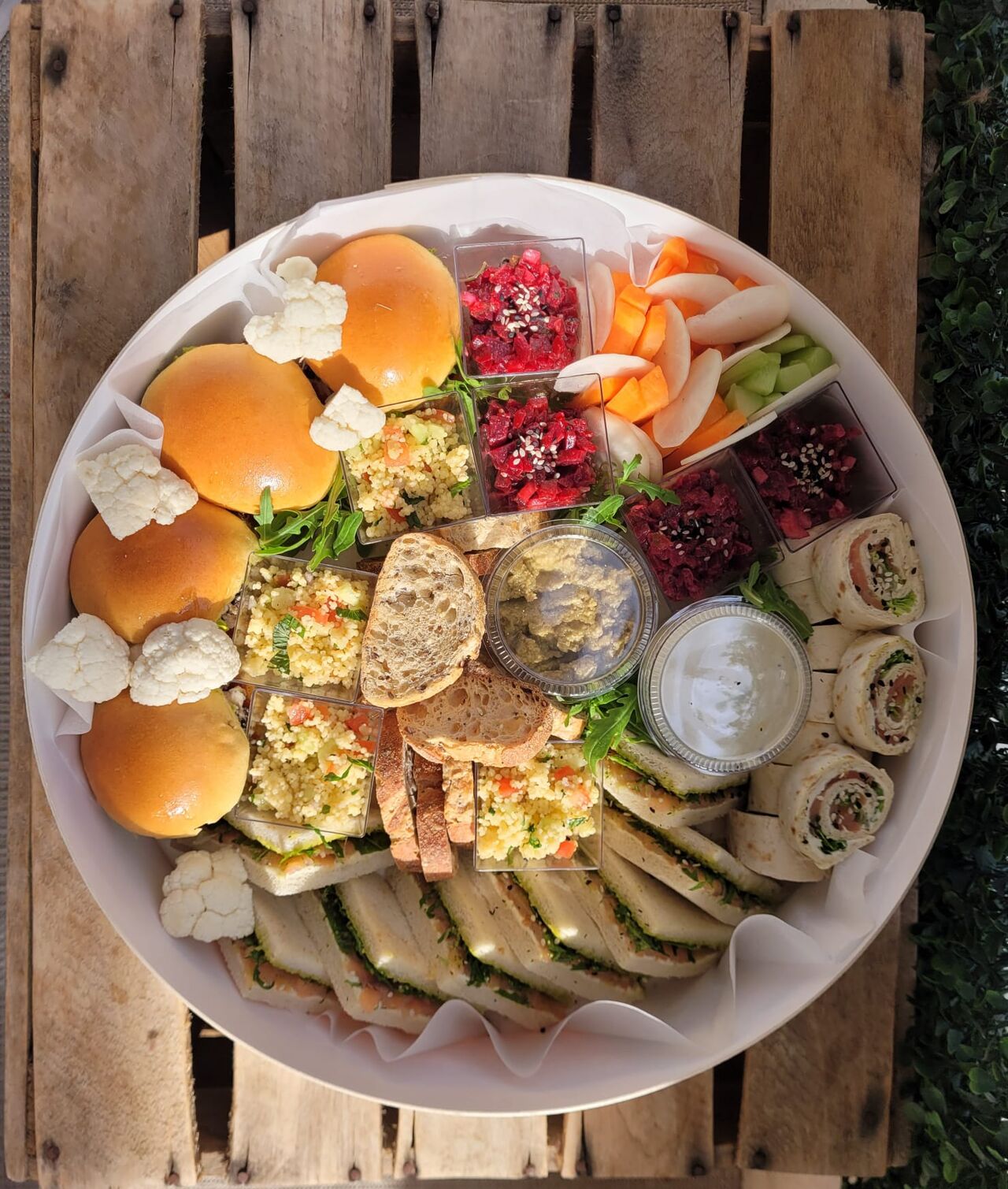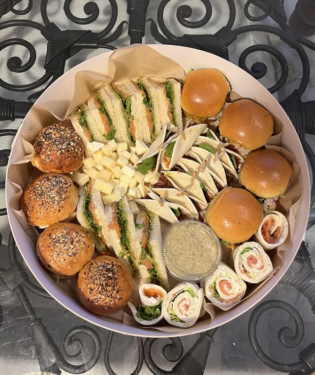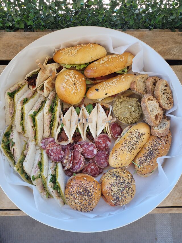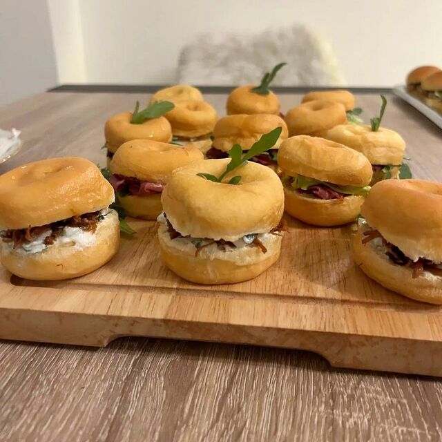 Le pain, les mini burgers et bagnats viennent du boulanger local. Les mini donuts salés du pâtissier. La charcuterie est tranchée le jour même.